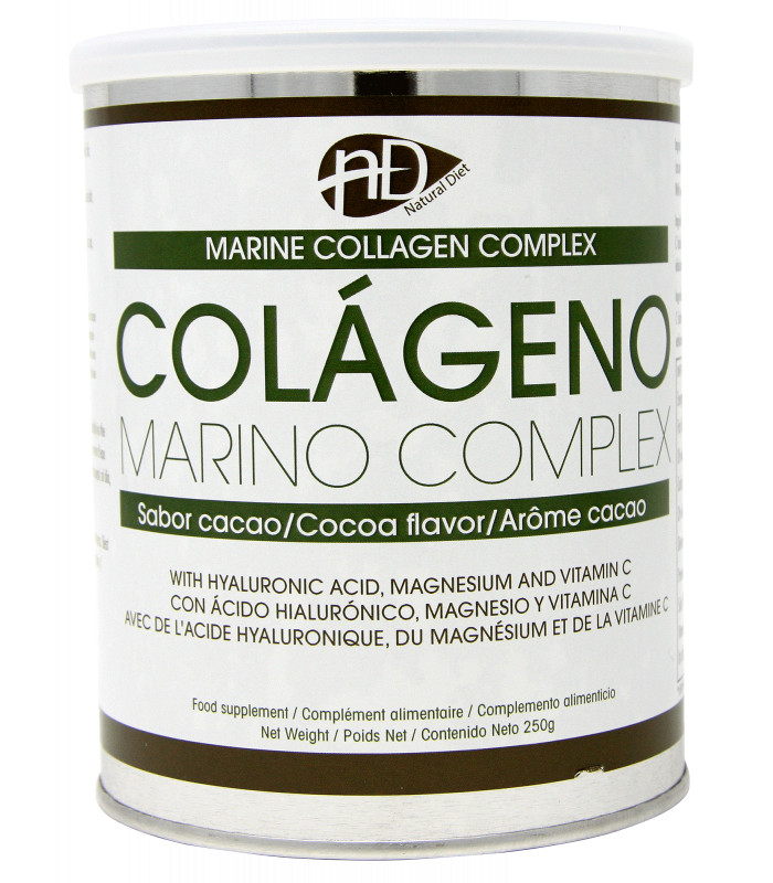 Colágeno marino hidrolizado (75%), magnesio (carbonato de magnesio), fructosa, vitamina C (ácido ascórbico), edulcorante (sucralosa), ácido hialurónico, cacao en polvo.